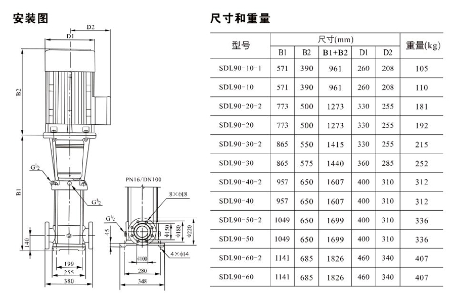 SDL90/SDLT90立式多級離心泵其管道式結(jié)構(gòu)可以確保泵可直接安裝在進(jìn)出在同一水平線上且管徑相同的水平管路系統(tǒng)中,這種設(shè)計使泵的結(jié)構(gòu)和管路更為緊湊。