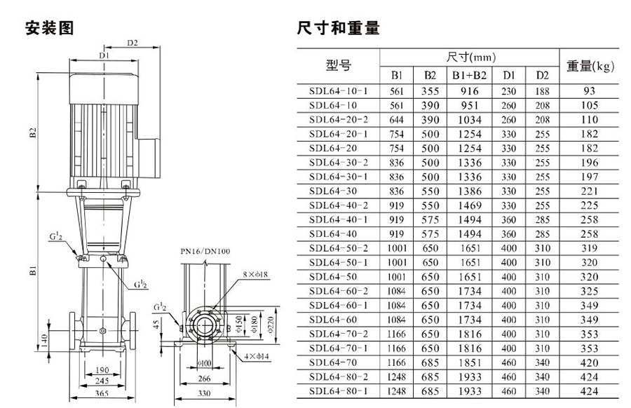 南元SDL64/SDLT64立式多級離心泵有不同的泵規格和不同級數,以滿足所需的流量和壓力。